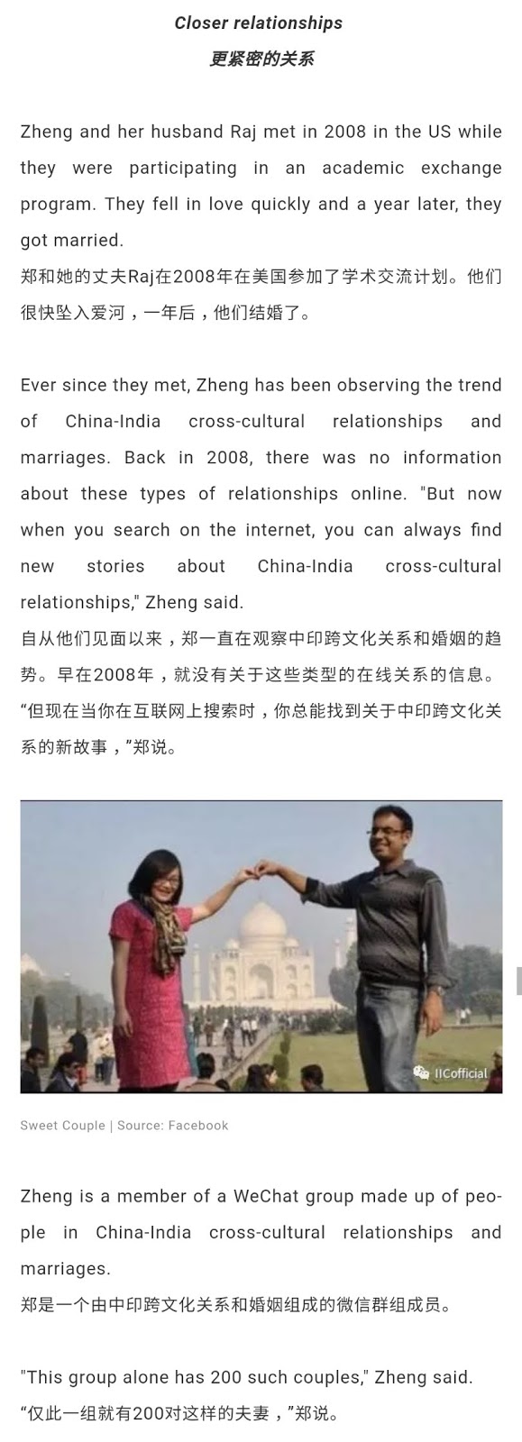 自从他们见面以来,郑一直在观察中印跨文化关系和婚姻的趋势。早在2008年,就没有关于这些类型的在线关系的信息。 “但现在当你在互联网上搜索时,你总能找到关于中印跨文化关系的新故事,”郑说。